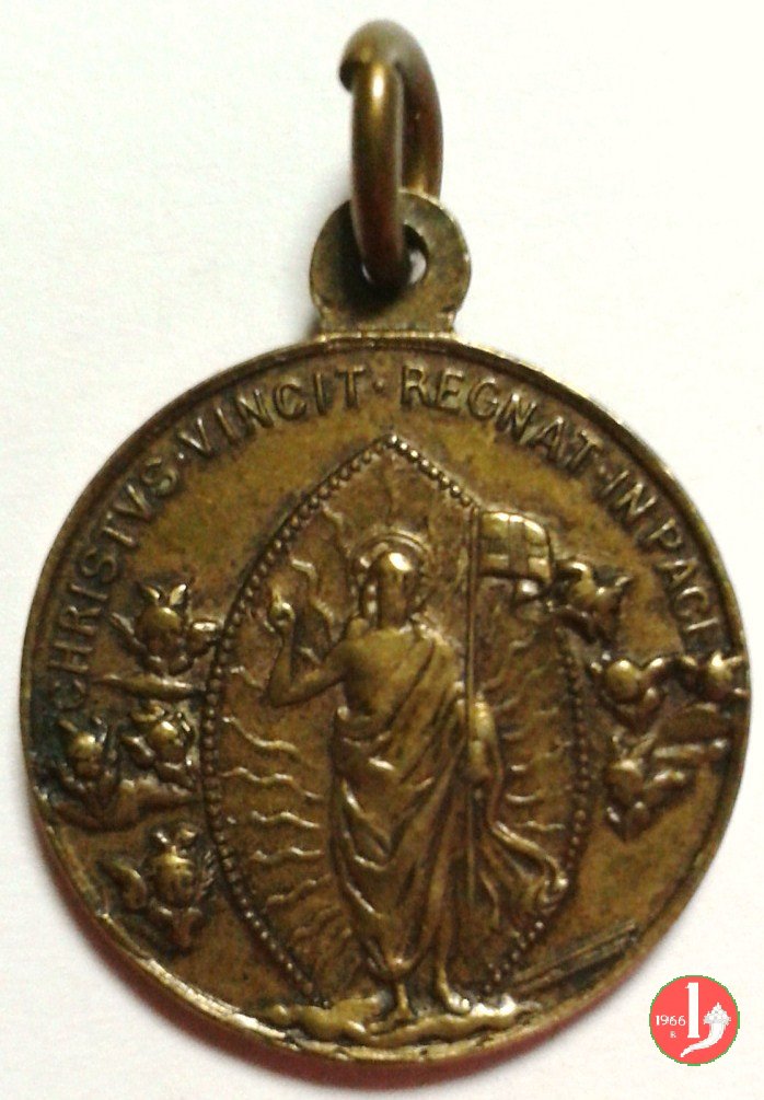 Giubileo 1900-Christvs vincit christvs 41mm Dritto: LEO • XIII • PONT • MAX • _ ANNO • JVBILARI • MCM busto a sx con berretto, mozzetta e stola sotto: L. GIORGI F. Cristo risorto benedicente entro mandorla perlinata, su altare, attorniato da Cherubini in basso, a dx: GIORGI | |
