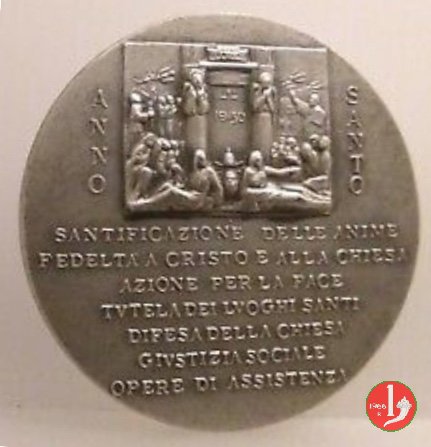 Apertura della Porta Santa Dritto: PIVS XIII PONT • MAX = ✠ ANNVS SANCTVS MCML ✠ busto a sx con zucchetto e piviale con girali e fiori il Papa seguito da vescovi e chierici batte col martello sull'anta con Px raggiante e apre la Porta Santa a sx | |