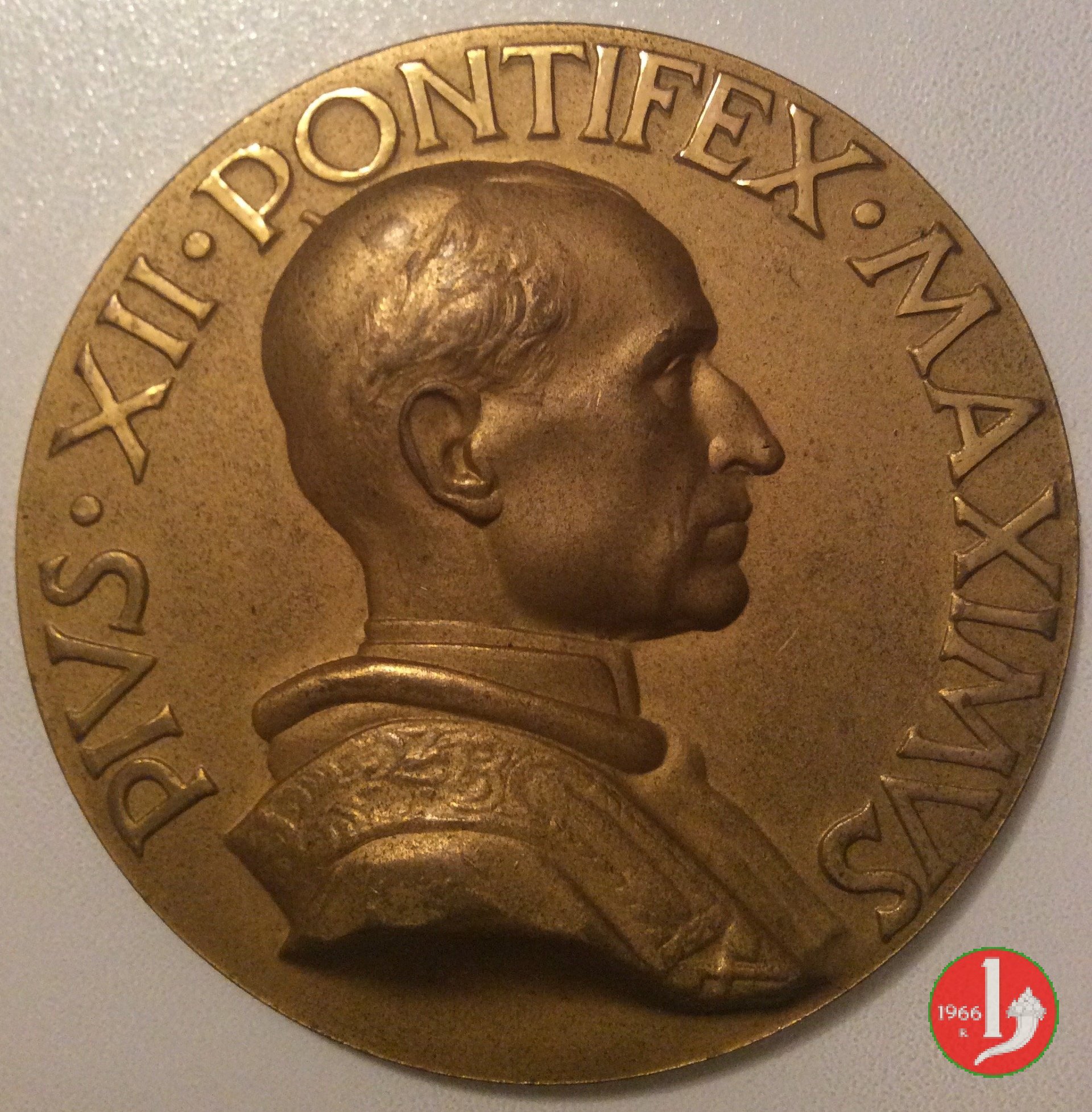 Uniface 145mm Dritto: PIVS XII • P. M. A. JVB. MCML ✠ busto benedicente a sx con zucchetto, mozzetta e stola sul taglio spalla: P. MORBIDVCCI | |