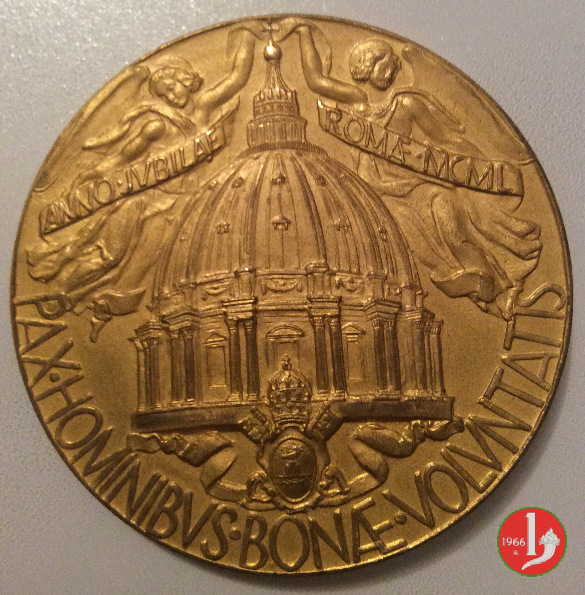 Croce Basiliche-SS. Apostoli Dritto: nella medaglia centrale:PIVS • XII • PONTIFEX • MAXIMVS busto a dx con berretto, mozzetta e stola nelle medaglie sui bracci: vista delle quattro Basiliche Patriarcali sullo sfondo, nella medaglia centrale: ANNO _ SANTO = ROMA _ MCML sui bracci laterali, entro medaglie: colombe convergenti al centro: PAX HOMIN _ BONA VOLVNTATIS nella medaglia in alto: busto di San Pietro, nimbato, di fronte, regge libro e chiavi nella medaglia, in basso: busto di San Paolo, nimbato, di fronte, regge spada | |