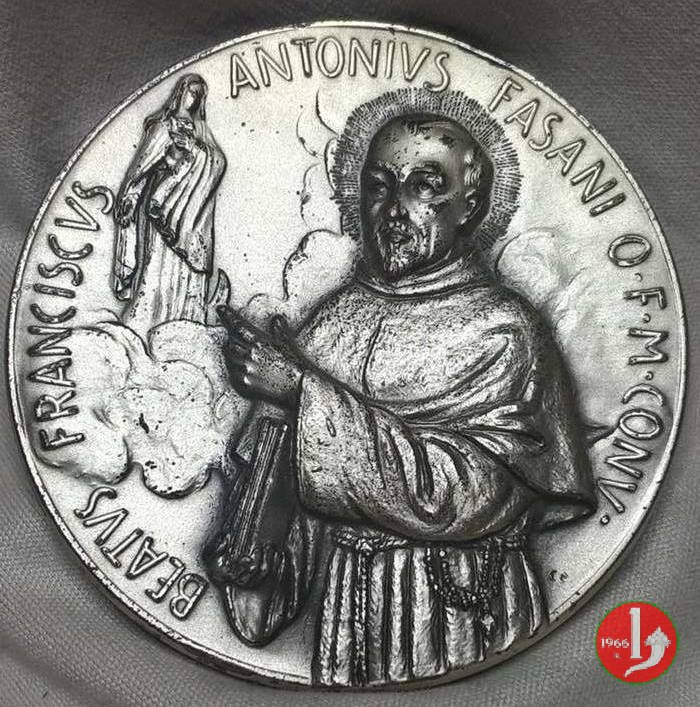 Beatificazione Francesco A. Fasani -CM187 Dritto: BEATVS FRANCISCVS ANTONIVS FASANI O • F • M • CONV • Il Beato Francesco Fasani di fronte indica statua della B.V. nel campo: PIO XII = SUMMO PONTEFICE = FR. BEDA M. HESS = POST SERAPHICUM = PATRIARCHAM = MINISTRO GENERALI = - CXII - | |