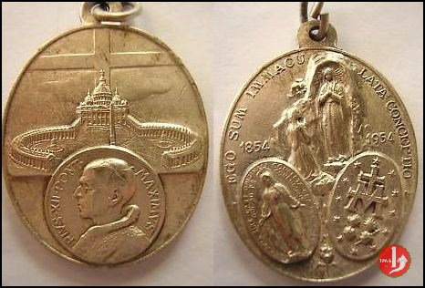 Immacolata Concezione Lourdes -CM234 Obverse: Piazza San Pietro con la Basilica di fronte, sormontata da grande croce sotto in medaglia: PIVS • XII • PONT • _ MAXIMVS busto a sx con berretto, mozzetta d'ermellino e stola Scena dell'apparizione nella Grotta di Luordes ai lati: 1854 _ 1954 sotto: fronte e verso della Medaglia detta "Miracolosa" | |