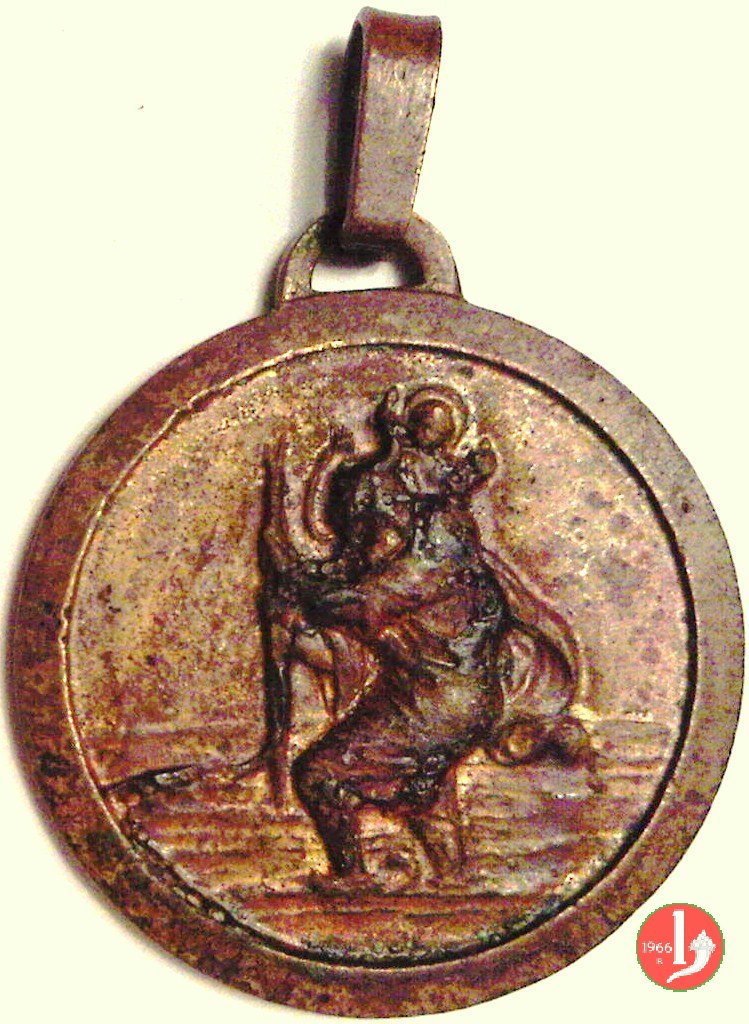 San Cristoforo ovale 30x22mm Dritto: JOANNES XXIII _ PONT. MAX. Busto a dx con berretto, mozzetta d'ermellino e stola sulla spalla: ITALY San Cristoforo nimbato col Bambino in spalla, raggiante e col globo crucigero, regge bastone del pellegrino in basso, a dx: ITALY | |