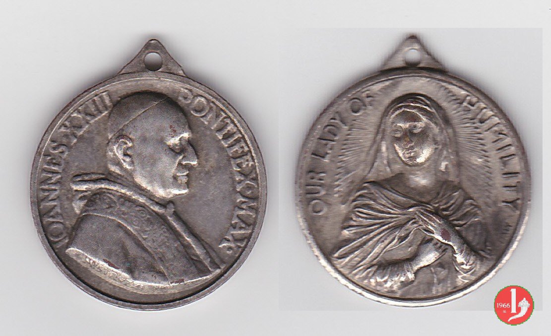 Our Lady for Humility 30mm -Mo355 Dritto: IOANNES • XXIII _ PONTIFEX • MAX • busto a dx con berretto, mozzetta e stola sul taglio spalla: MISTRVZZI in basso, a dx: PAGANI busto della B. V. Maria velata e raggiante con mani conserte | |