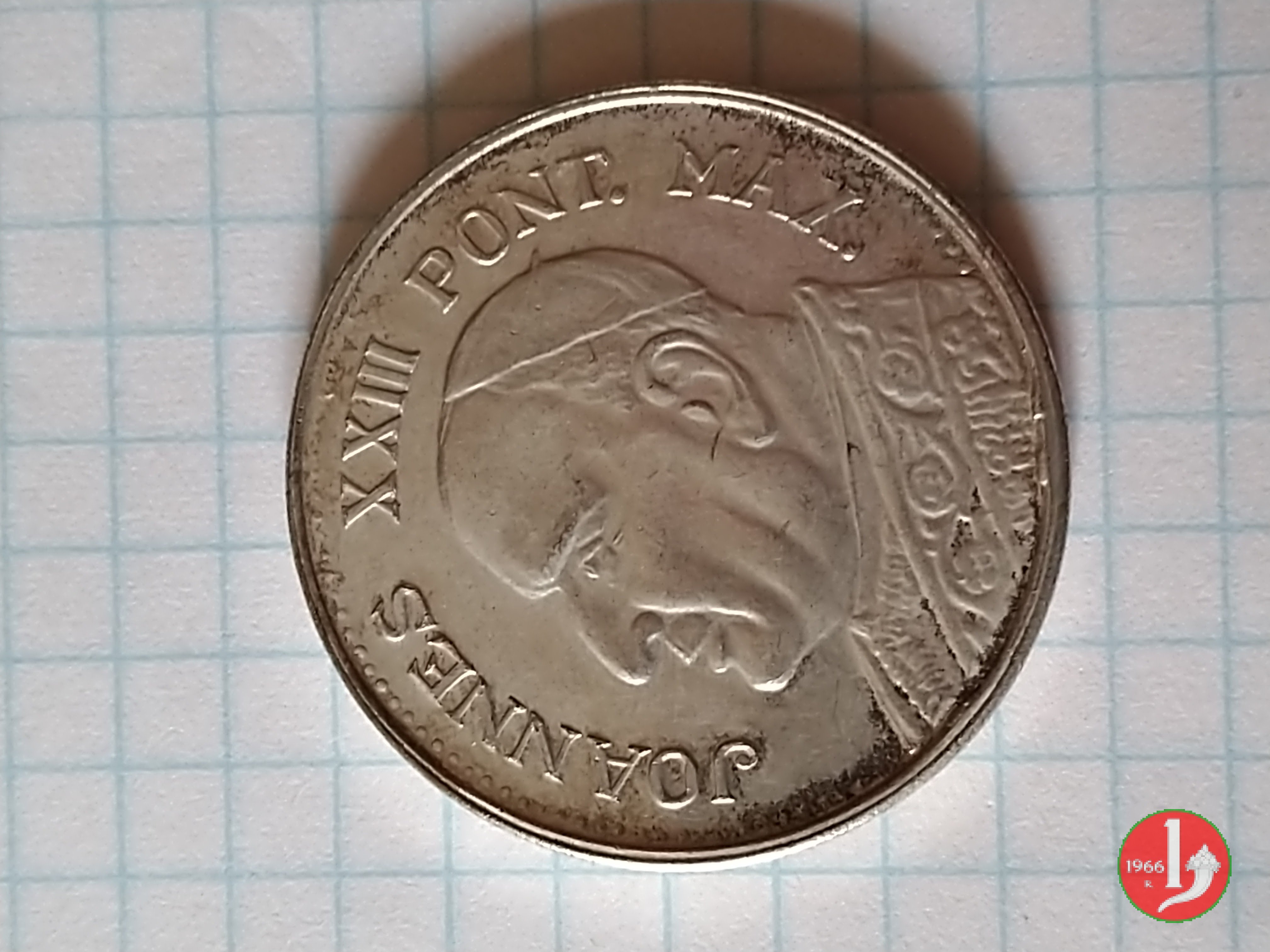 Concilio Vaticano II Dritto: _ • IOANNES • XXIII • _ • PONT • MAX • busto a sx con triregno e pallio Stemma Papale su chiavi decussate e coronato da triregno in basso: ARGOR 900/1000 | |