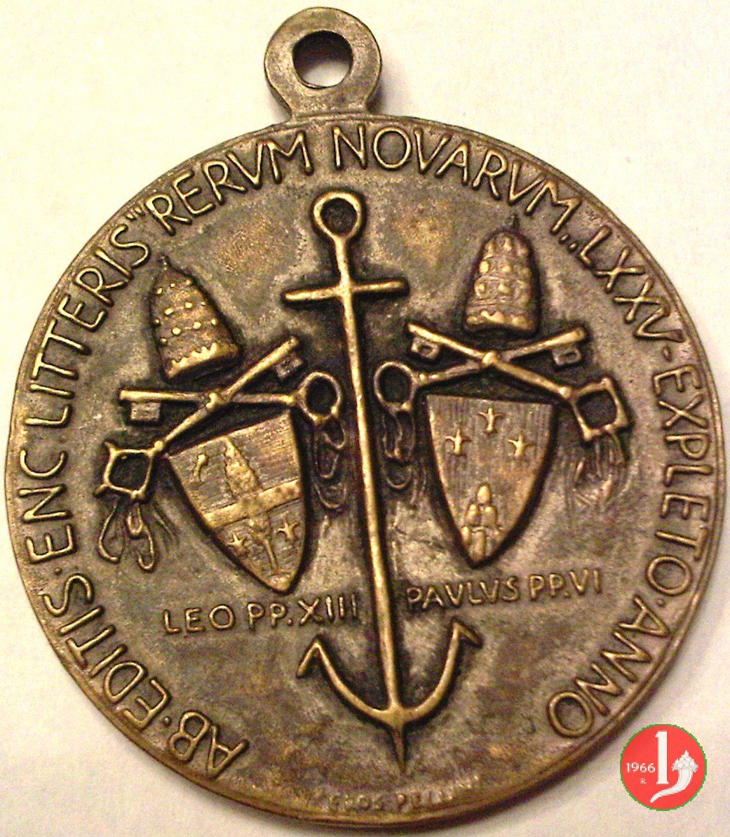 75° Enciclica Rerum Novarum 44mm -MM202 Dritto: AB • EDITIS • ENC. LITTERIS "RERVM NOVARVM" LXXV • EXPLETO • ANNO Stemmi affiancati di Paolo VI e Leone XIII coronati da triregni e chiavi decussate divisi da ancora verticale sotto: LEO PP. XIII _ PAVLVS PP. VI in basso: EROS PELLINI Gesú in piedi nimbato di fronte regge ascia, sullo sfondo donna raccoglie i frutti della terra e casa con alberi | |