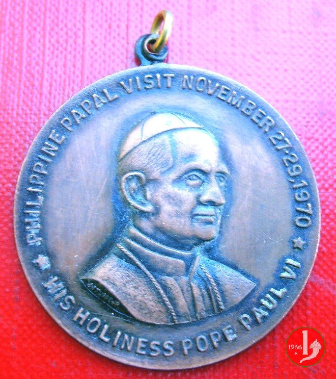 Viaggio nelle Filippine 27-11-1970 Dritto: PHILIPPINE PAPAL VISIT NOVEMBER 27 • 29, 1970 = * HIS HOLLINESS POPE PAUL VI * busto di 3/4 a dx con berretto, abito talare e Croce pettorale (catena) sul taglio spalla: JJTUPARUP Stemma Papale su chiavi decussate e coronato da triregno | |