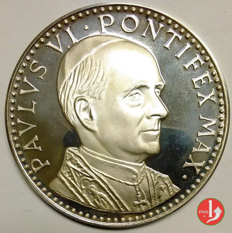 Lumen Gentium Dritto: PAULUS • VI • SUMMUS • PONTIFEX busto di 3/4 a dx sulla dx: Colomba in volo con ramo d'ulivo e prospetto della Basilica Vaticana Chiavi decussate coronate da triregno sotto: LUMEN GENTIUM | |