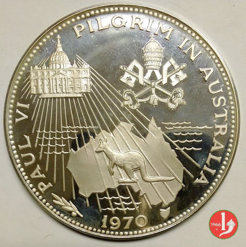 Viaggio in Australia 30-11-1970 Dritto: PAVLVS VI • PONTIFEX MAX • busto di 3/4 a dx con zucchetto, abito talare, Croce pettorale e stola Basilica di San Pietro raggiante sul profilo geografico dell'Australia sormontata da triregno su chiavi decussate e caricata di canguro in basso: 1970 | |