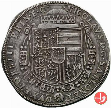 Ducatone Obverse: • NICOLAVS • D • G • SABLONET • DVX • ET • OBSTIL • PRIN • E • C • Scudo in cartella ornata inquartato Guzman, Carafa, Gonzaga e Spagna e con al centro piccolo scudo spaccato di aquila imperiale bicipite e scritta LIBERTAS in banda, il tutto sormontato da berrettone coronato. Intorno, il collare dell'Ordine del Toson d'Oro. La Beata Vergine stante su crescente lunare con in braccio il Bambino, con un'aureola di 8 stelle e circondata da raggi. Nel giro in b., data. | |