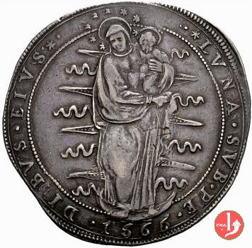 Mezzo ducatone 1605 Obverse: • ALOY • C • CARRAF • ET • ISABEL Scudo spaccato di aquila bicipite e banda con scritta LIBERTAS, in cartella ornata e sormontata da corona su cuscino, il tutto circondato dal Toson d'Oro. La Beata Vergine stante su crescente lunare con in braccio il Bambino, con un'aureola di 8 stelle e circondata da raggi. Nel giro in b., data. | |