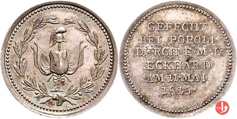 Battaglia di Popoli 1815 -B1617 Dritto: Trofeo d'armi entro corna di alloro legata in basso da nastro Verso: nel campo: GEFECHT = BEI POPOLI = DUCH F • M • L • = ECKHARD = AM 11 • MAI = 1815 • | |