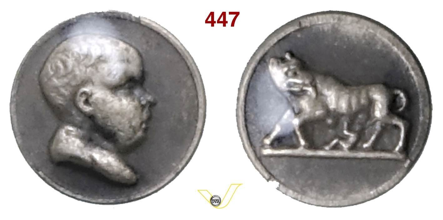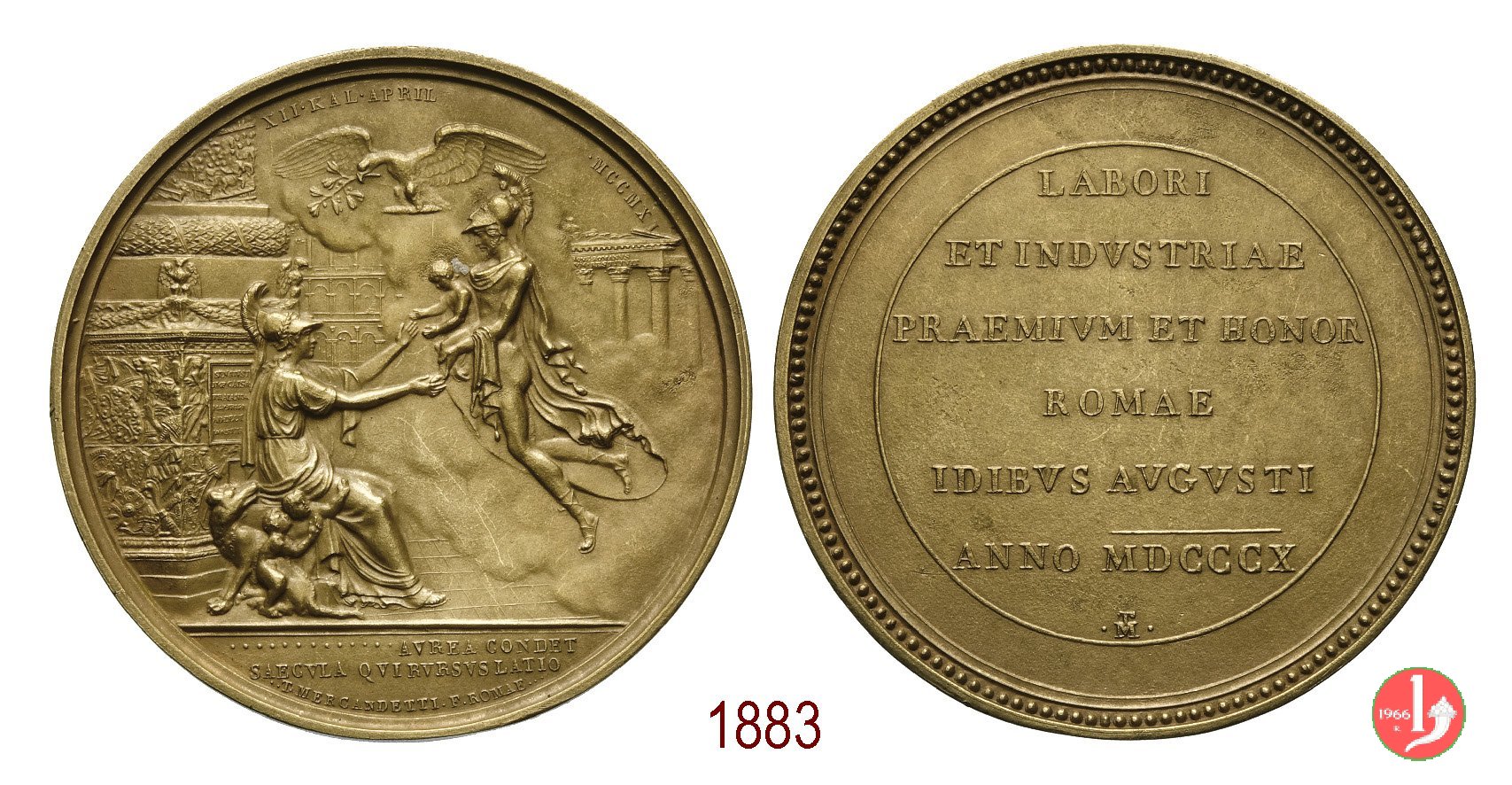 Premio Scuola di Belle Arti di Roma 1811 Dritto: XII • KAL • APRIL • MCCMXI • Minerva, seduta verso dx, ai piedi della Colonna Traiana, allunga le braccia verso il cielo, per ricevere un bambino portato nelle braccia di Marte, circondato da nubi e preceduto da un'aquila, vicino a Minerva lupa Capitolina con i gemelli, sullo sfondo il Colosseo e il Tempio della Concordia in esergo:............. AVREA CONDET SAECVLA QVI RVRSVS LATIO. sotto: T. MERCANDETTI • F. ROMAE • in basso, monogramma: • TM • | |