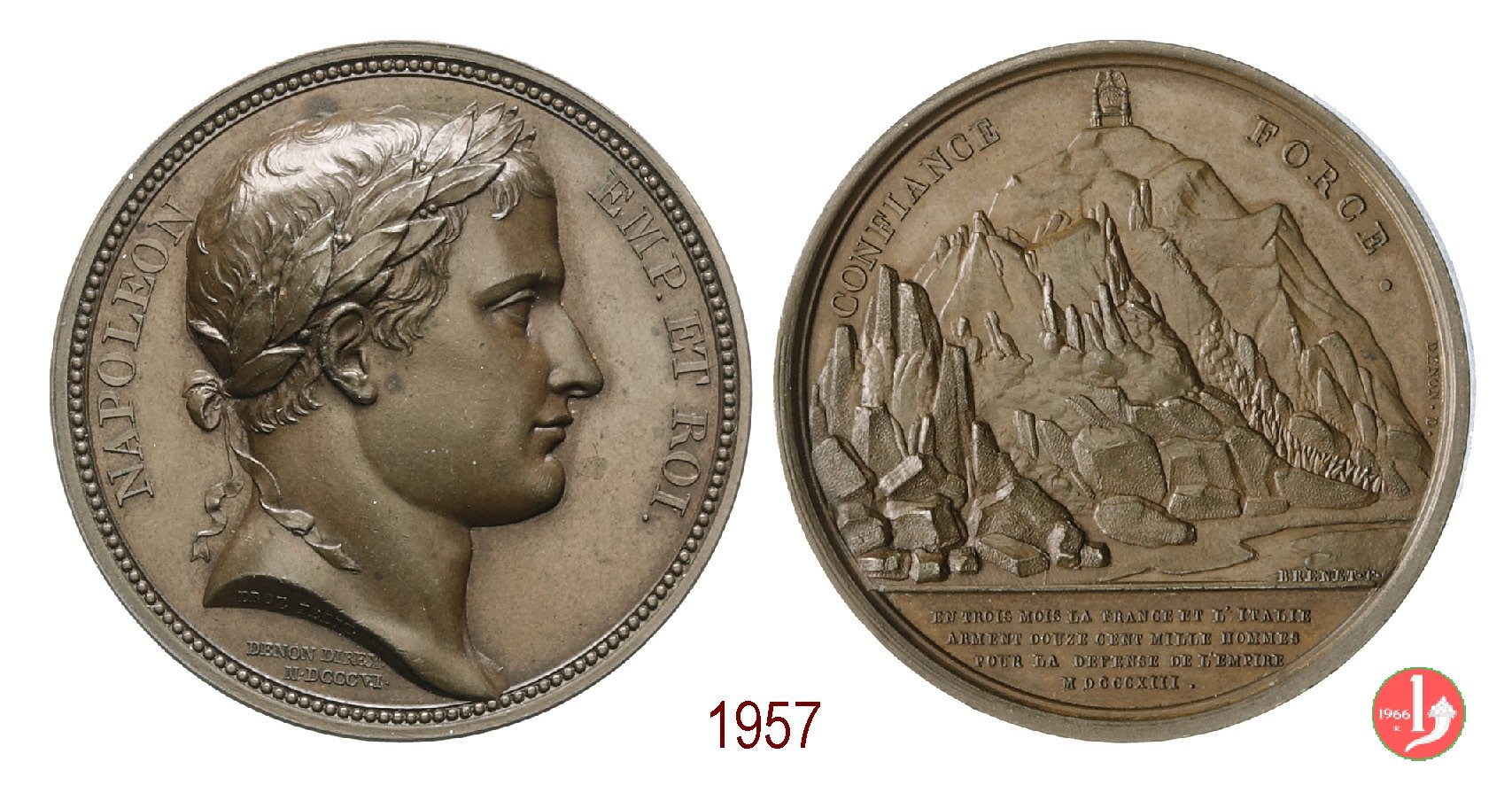 Monumento sul Moncenisio -B1233 Dritto: NAPOLEON _ EMP. ET ROI. busto nudo laureato a dx sul taglio del collo: ANDRIEU • F • vista della sommità del Moncenisio con il monumento - trono in basso, a dx: BRENET in esergo: EN TROIS MOIS LA FRANCE E L'ITALIE = ARMENT DOUZE CENT MILLE HOMMES = POUR LA DEFESE DE L' EMPIRE = MDCCCXIII. | |