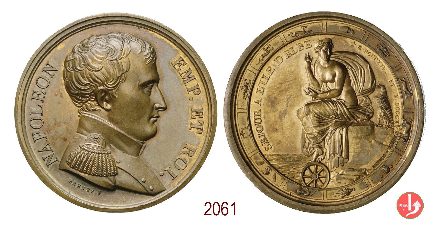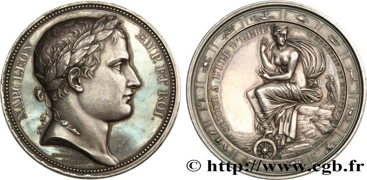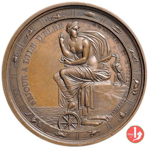 Soggiorno all'Isola d' Elba -B1585 Dritto: NAPOLEON testa a dx sul taglio del collo: ANDRIEU • F • figura allegorica, velata, diademata, seduta su uno scoglio verso sx e volta di 3/4 a sx, mira ad aquila e ruota con i piedi timone in basso, a dx: BRENET. F. DENON D. | |