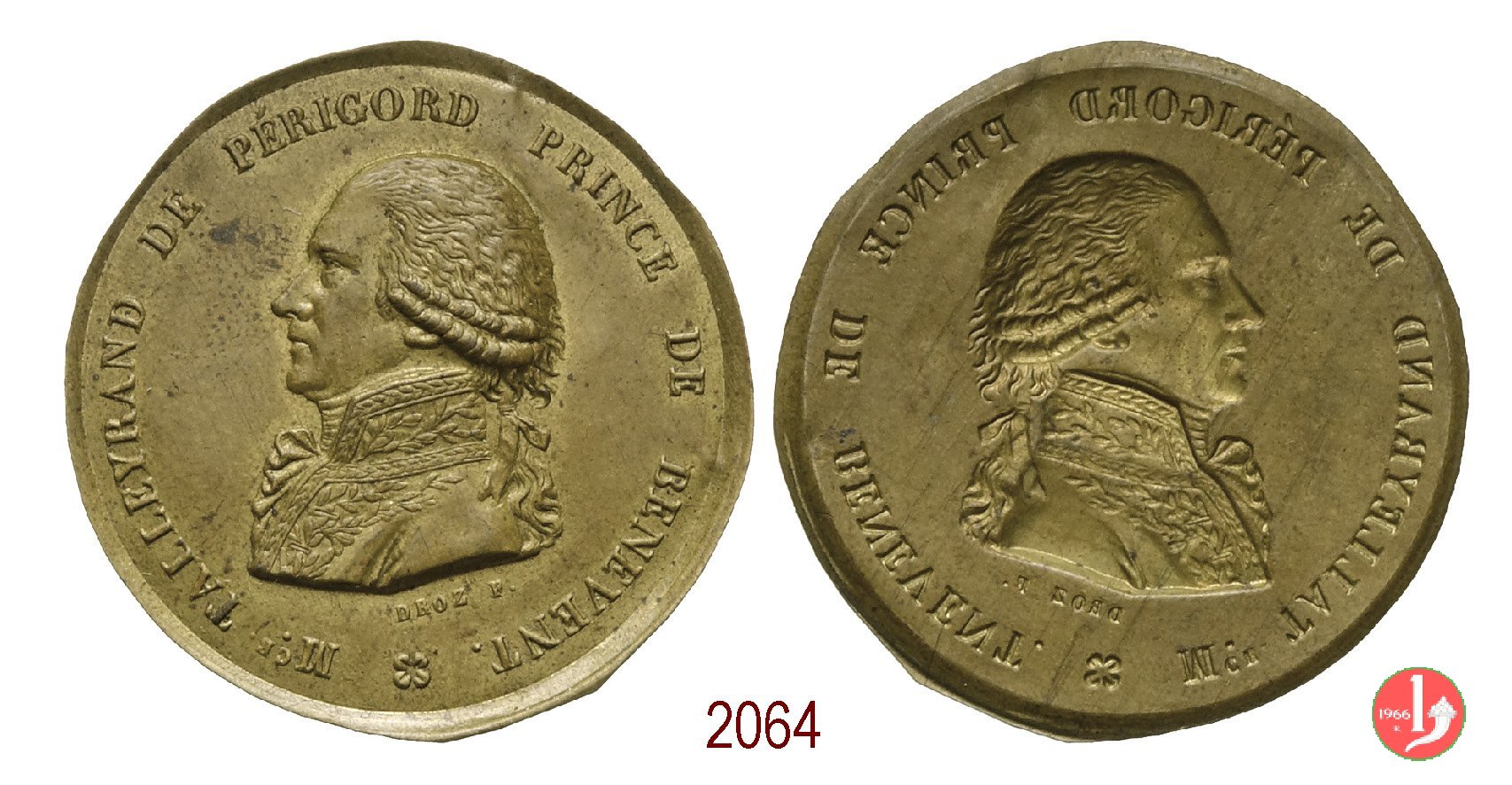 Talleyrand De Périgord Principe di Benevento 1815 -B1598 Dritto: M •CE TALLEYRAND DE PÉRIGORD PRINCE DE BENEVENT • Busto a sx con uniforme e codino con nastro sotto: DROZ F. | |