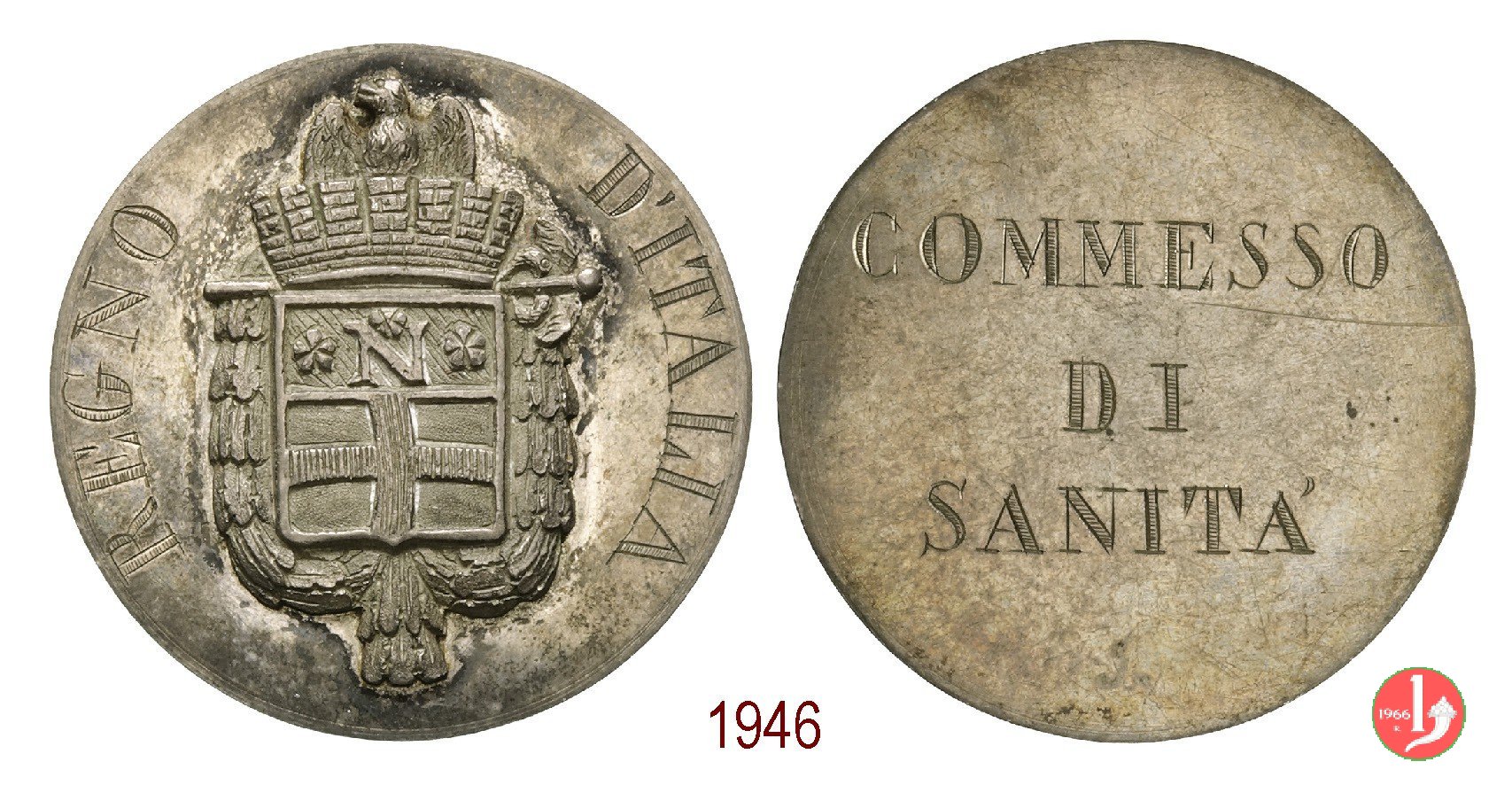 Commesso di Sanità 1813 Dritto: REGNO _ D'ITALIA Stemma turrito di Milano sormontato da aquila imperiale e caduceo, entro festone | |