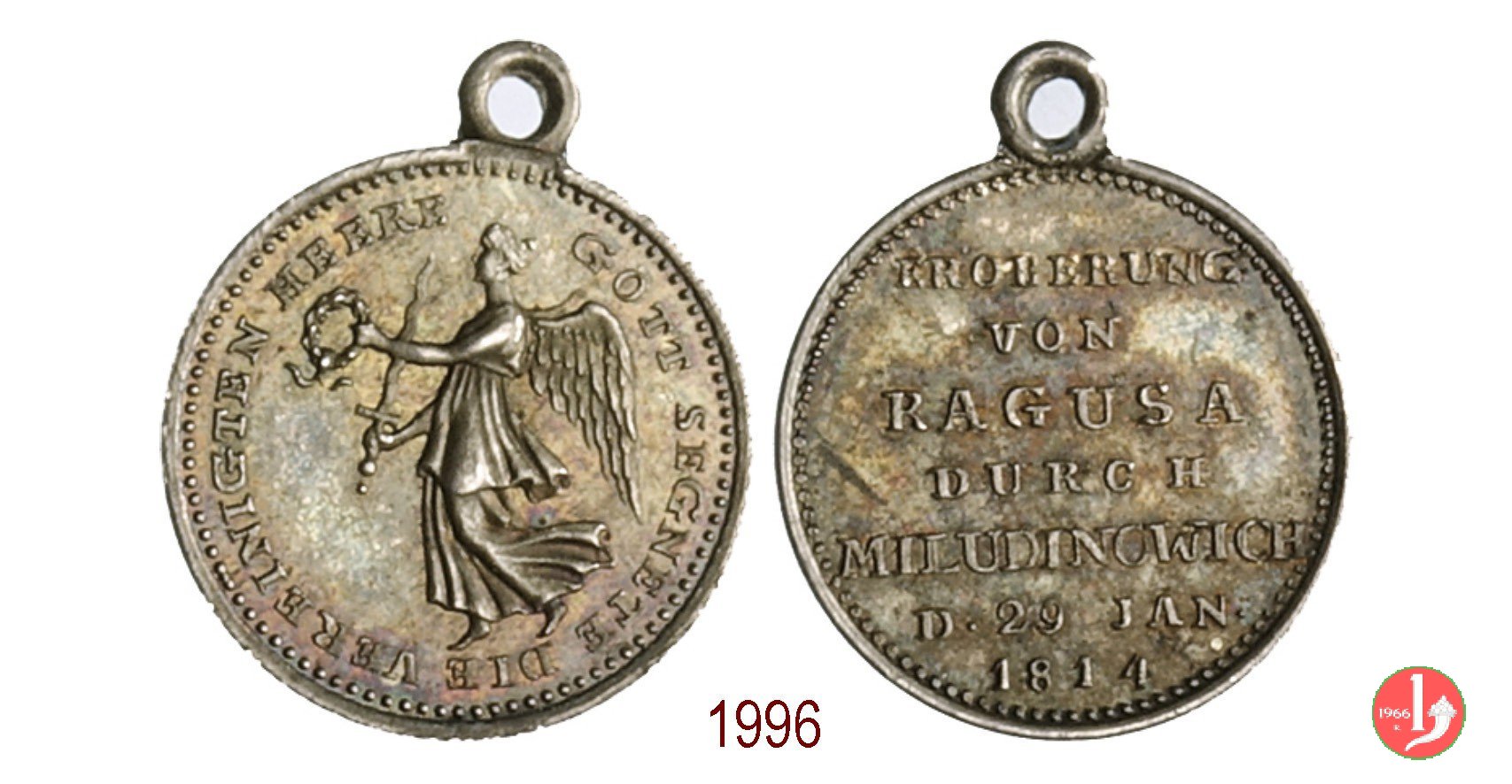 Presa di Ragusa 1814 -B1334 Dritto: GOTT SEGNETE DIE VEREINIGTEN HEERE la figura allegorica della Vittoria alata, in piedi e gradiente a sx, regge spada e serto l'alloro | |