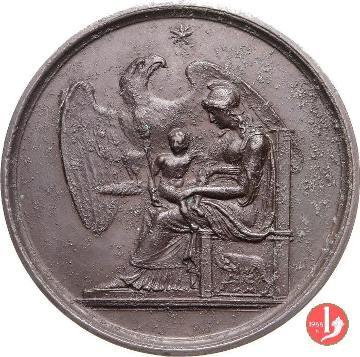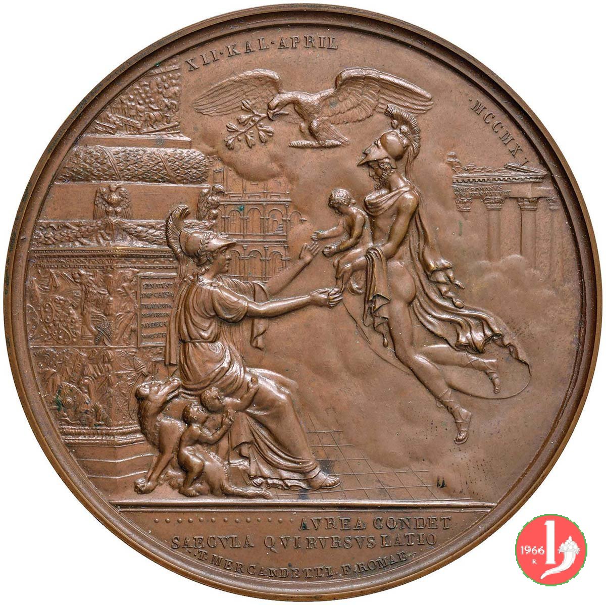 Nascita del Re di Roma 1811 -B1105 Dritto: XII. KAL. APRIL. _ MCCMXI. la figura allegorica di Roma seduta verso dx, su sgabello con la Lupa capitolina, riceve da Minerva elmata il neonato, in alto aquila imperiale ad ali spiegate sulla base della colonna: SENATVS. POP. IMP. CAESAR TRAIANO. A MAX. TRIB. P. AD. DECLA MONS. ET. I. // SQUE. ROMANVS. VM. RESTITVIT.