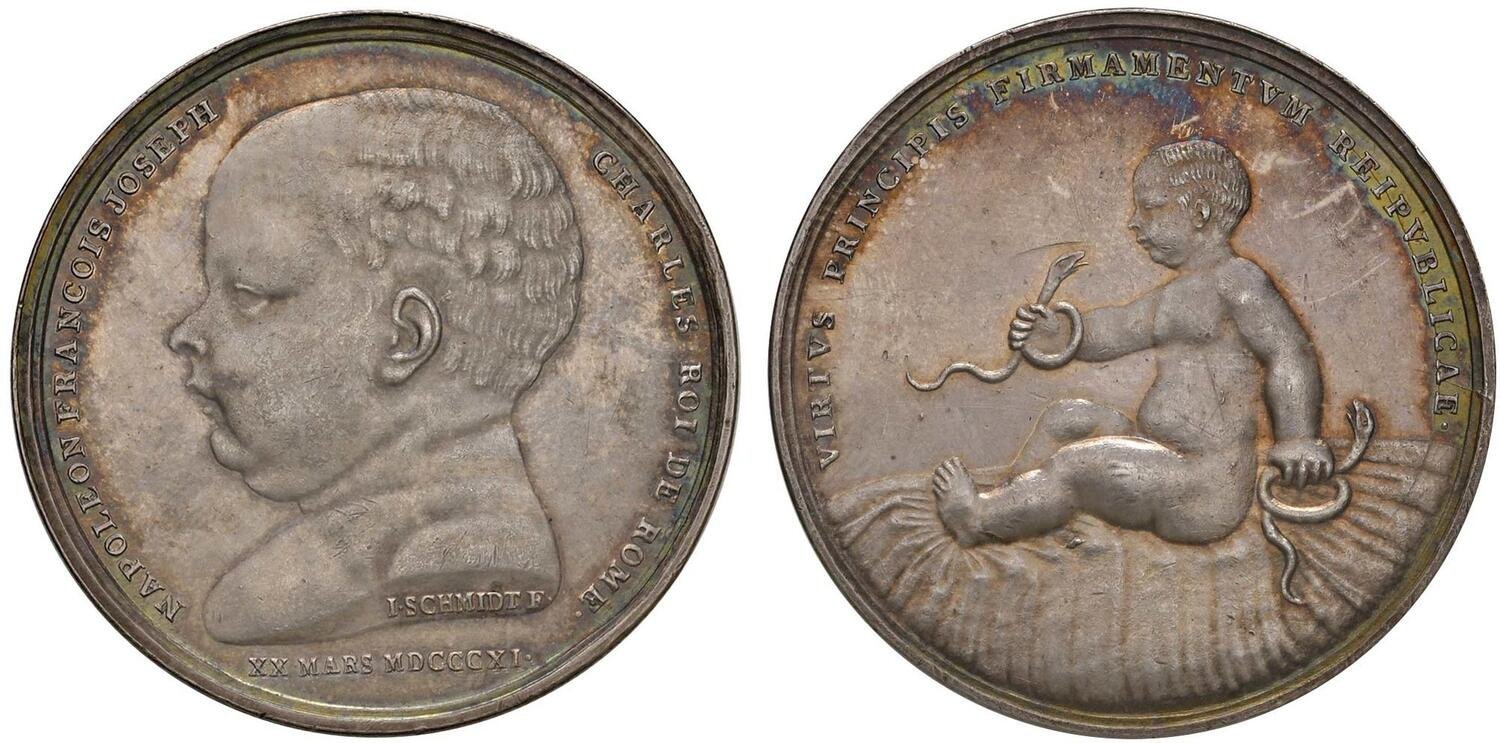 Nascita del Re di Roma 1811 -B1108 Dritto: NAPOLEON FRANÇOIS JOSEPH _ CHARLES ROI DE ROME busto a sx del Re di Roma sul taglio busto: I. SCHMIDT F. sotto: XX MARS MDCCCXI. Il Re di Roma nudo e seduto verso sx regge due serpi | |