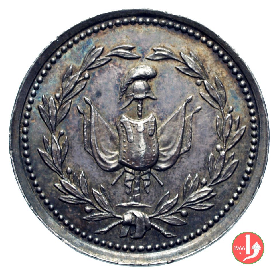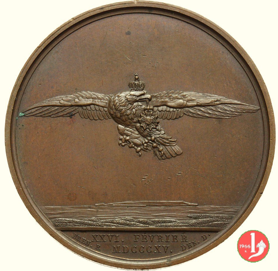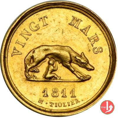 Ritorno dall'Isola d'Elba 1815 -B1597 Dritto: Aquila in volo sull'Isola d' Elba, regge fulmini tra gli artigli; a sx tempio corinzio di Giano con porta in frantumi, sulla trabeazione: TEMPLVM. JANI. in esergo: XXVI • FEBRUARY = MDCCCXV. in basso: Mercurio con elmo alato e mantello, in volo verso sx, regge caduceo e pergamena col l'iscrizione = TO = ARMS in esergo: XIII MARCH. | |