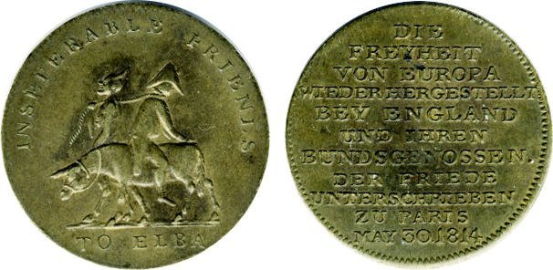 Napoleone all'Isola d' Elba 1814 -B1415 Dritto: INSEPARABLE FRIENDS demonio volto a sx, regge con corda al collo militare con cappello a tricorno (Napoleone) volto a dx e a cavallo di un asino in esergo: TO ELBA nel campo: EMP. = OF RUSSIA = K • OF RUSSIA = MARQUIS = WELLINGTON = PRINCE = SCHWARTZEN- = BERG in basso circolarmente: MARCH 31 • 1814 | |