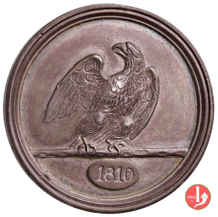 Nascita del Re di Roma 1811 -B1106 Dritto: busti nudi accollati a sx della figura allegorica di Roma elmata e del Re di Roma Verso: Aquila su saetta in esergo, entro ovale: 1810 | |