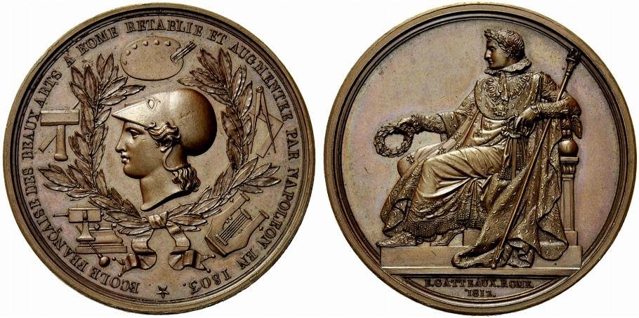 Scuola Francese di belle arti Roma -B1178 Dritto: ECOLE FRANÇAISE DES BEAUX ARTS A ROME RETABLIE ET AUGMENTÉE PAR NAPOLEON EN 1803. * entro rami d'alloro, legati in basso da nastro e affiancati da trapano e banco da lavoro, martello e scalpello, tavolozza e pennelli, compasso e squadro, lira: testa di Minerva elmata a sx in esergo: E. GATTEAUX. ROME. = 1812. | |