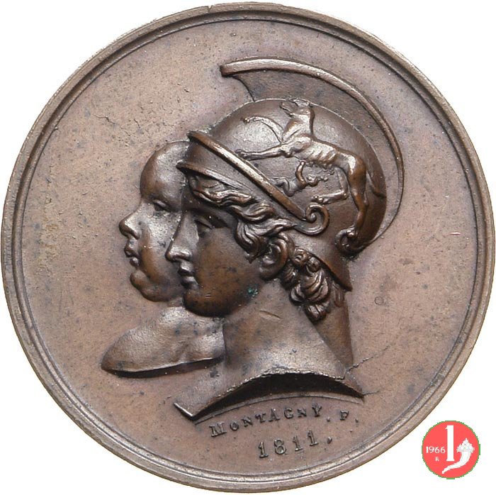 Nascita del Re di Roma 1811 -B1103 Dritto: busti accollati del Re di Roma e della figura allegorica di Roma elmata sotto: MONTAGNY. F • = 1811. | |