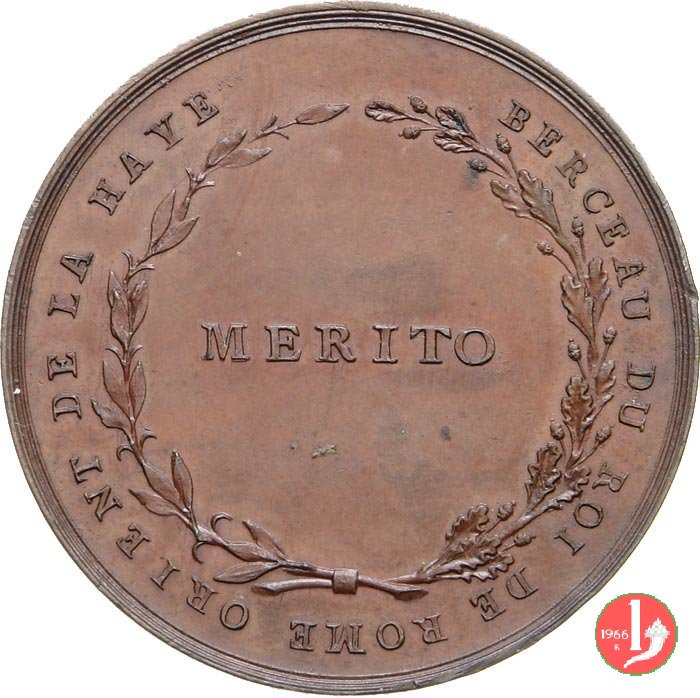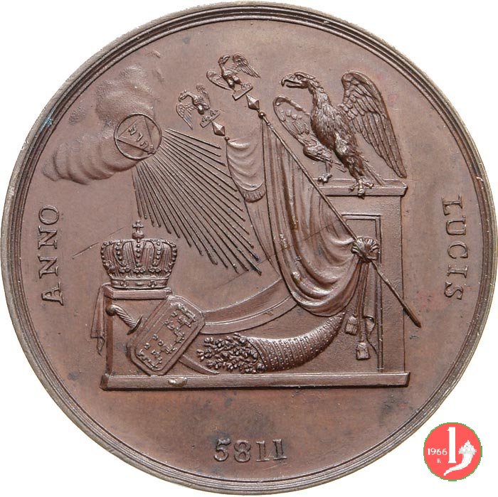 Loggia Culla del Re di Roma 1811-B1147 Dritto: ANNO _ LUCIS = 5811 La culla con bandiere, aquila Imperiale, corona e cornucopia, irraggiata da triangolo entro cerchio entro rami di quercia e d'alloro: MERITO | |