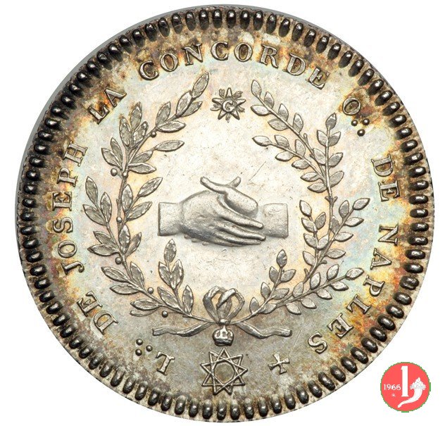 Giuseppe Napoleone - Loggia Concordia di Napoli -B1213 Dritto: L due mani si stringono entro rami d'alloro legati in basso da nastro e sormontati da stella raggiante G Bilancia tra due colonne doriche | |