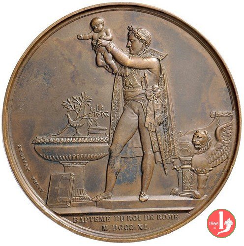 Battesimo del Re di Roma -B1125 Dritto: Napoleone laureato, in piedi, solleva il Re di Roma a sx a sx: fonte battesimale a dx: trono in esergo: BAPTEME DU ROI DE ROME = M.DCCCXI | |