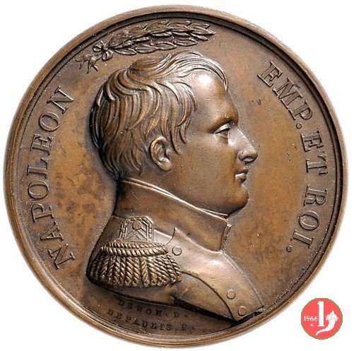 Nascita del Re di Roma 1811 -B1102 Dritto: XX MARS _ MDCCCXI. busto a dx del Re di Roma con cappuccio busti accollati a dx delle figure allegoriche di Parigi diademata e con cappello e di Roma elmata sul taglio spalla: GALLE F. sotto: MDCCCIX. | |