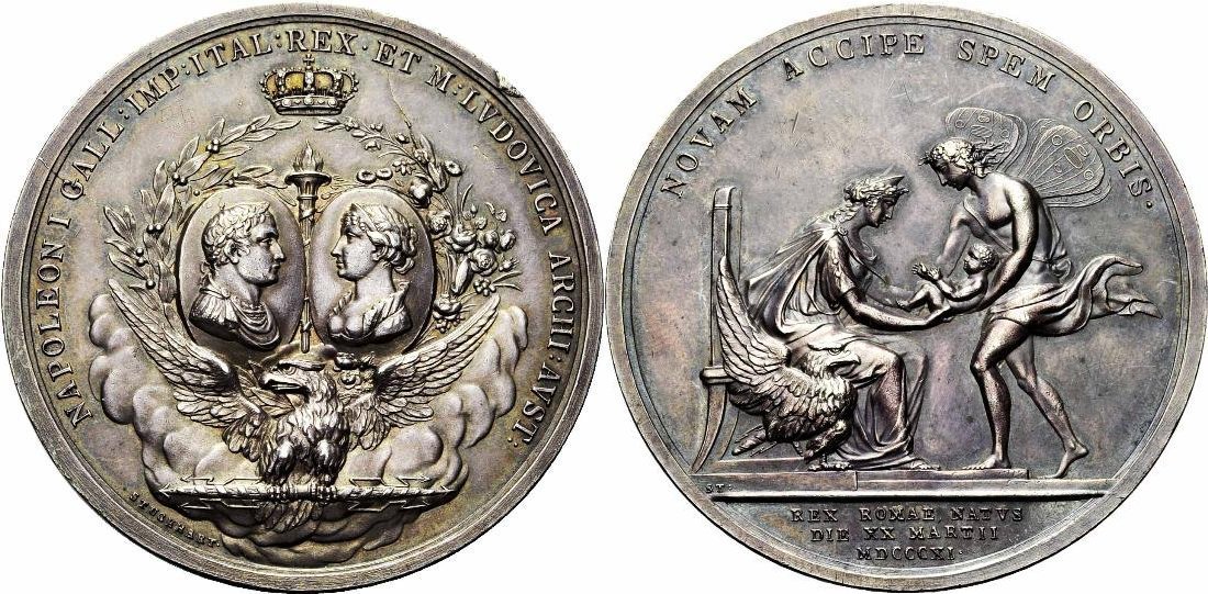 Nascita del Re di Roma 1811 -B1119 Dritto: NAPOL.on EMP. ET ROI. N.on ROI DE ROME NE LE 20 MARS 1811. M • L • IMP. ET R.ne F.s II EMP. D.re M. L.se B.ix IMP. D.che sei busti accollati e in gruppo volti a dx sotto: HEURTAUX in basso: S.A. JMP. M.e M.se DE NAP.on | |