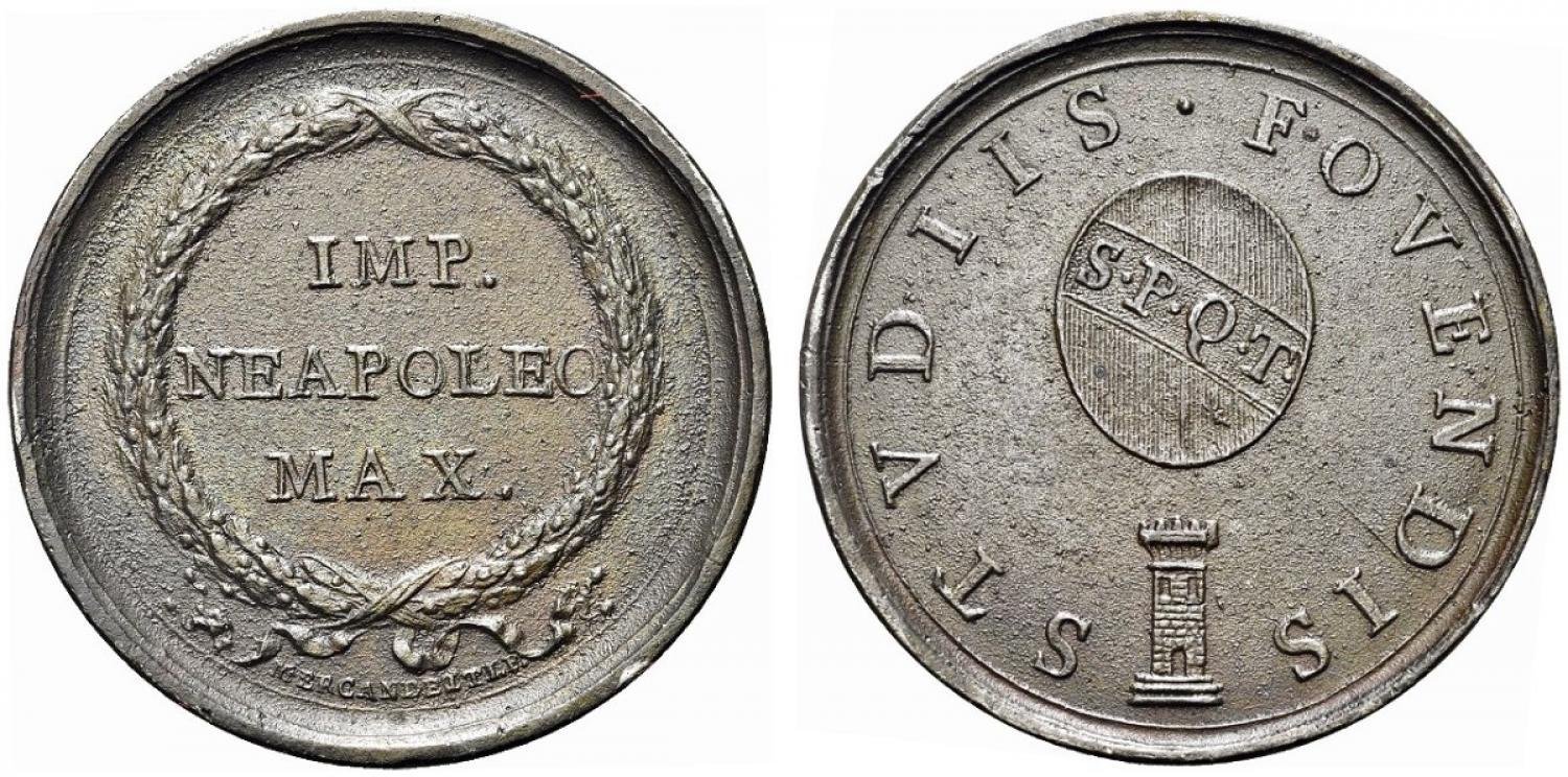Premio della Città di Castello -B1070 Dritto: entro ghirlanda d'alloro retta in alto e in basso da nastri incrociati: IMP. = NEAPOLEO = MAX. in basso: MERCANDETTI.F. nel campo: Stemma in ovale di Città di Castello S.P.Q.T. in basso: TORRE | |