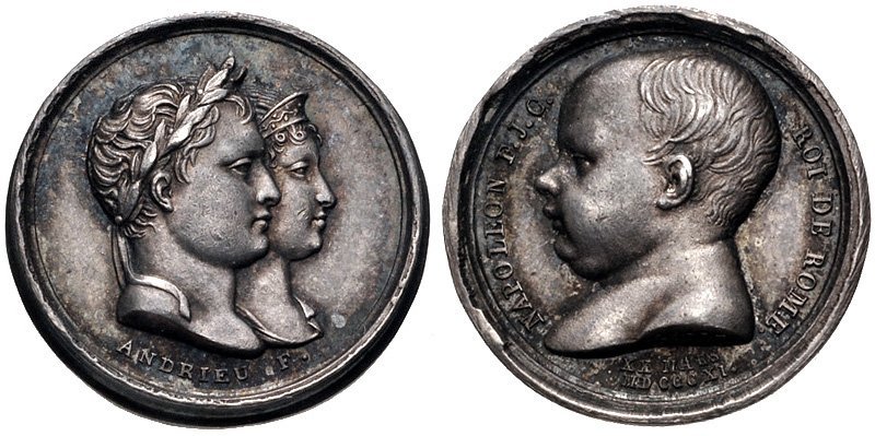 Nascita del Re di Roma 1811 -B1116 Dritto: NAPOLEON Ier MARIE LOUISE. N. F. J. C. ROI DE ROME i tre busti accollati a dx di Napoleone laureato e Maria Luisa diademata con piccolo busto del Re di Roma tra i due | |