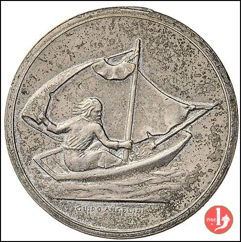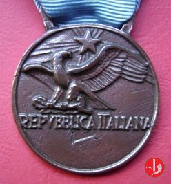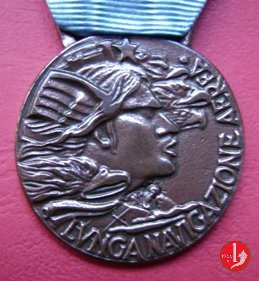 Medaglia di lunga navigazione aerea Dritto: Affiancata da cinque teste di aquila, la testa alata d'Italia, con corona turrita, sulla quale è una stella a cinque punte; sotto, la parte superiore del globo terracque, emergente da un banco di nubi; a destra la firma dell' autore P.MORBIDUCCI Verso: Nei tre quinti superiori del campo, un'aquila ad ali spiegate, con la testa rivolta a destra verso una stella a cinque punte, raggiante, e che stringe fra gli artigli un ramo di quercia; sotto: "REPUBBLICA ITALIANA"; in esergo, nel giro la sigla Z indicante la coniazione ad opera della zecca di Roma. | |
