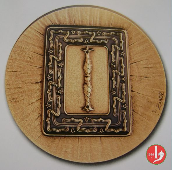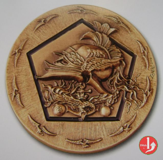 Scioglimento 53° Stormo Dritto: Al centro della medaglia campeggia l'araldica del 53° Stormo, la carta da gioco Asso di Spede su cui è la legenda 53° STORMO / CACCIA posta su fondo raggiato, intorno una fascia di smalto blu; a destra lungo il bordo la firma dell'artista e la data VII 99. Verso: Nel campo e su cinque righe la scritta 53° STORMO = "G.CHIARINI" = 21 GRUPPO A.W.X. = CAMERI = 1.4.1967 - 28.7.1999; in primo piano, il puntale dell'asta della bandiera di Guerra dello Stormo, su cui è scritta incisa "2 M.A.V.M." indica il numero delle medaglie d'argento al Valor Militare conferite allo Stormo in operazioni belliche durante la Seconda Gueraa Mondiale, al centro della medaglia, la silhouette grafica di un Tornado con i contrassegni dello Stormo, incrociato da un F104, in secondo piano, velivolo in dotazione per oltre trenta anni presso il 53° Stormo; tra le pieghe del drappo della bandiera, la firma dell'artista e la data VII 99. | |