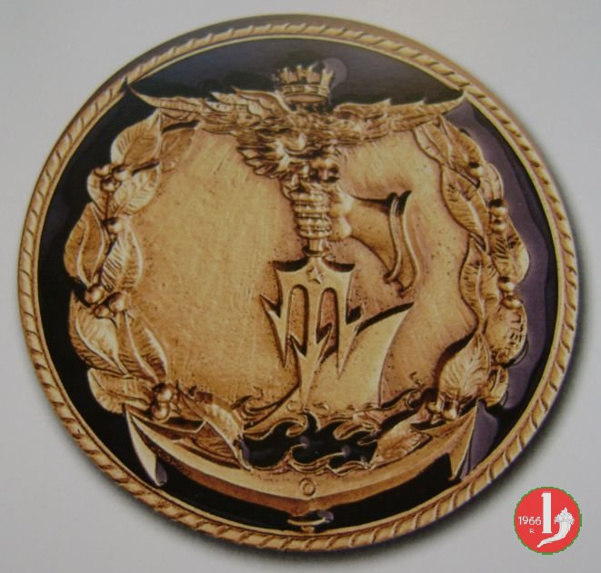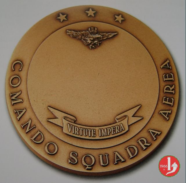 Comando Squadra Aerea Dritto: Raffigurato lo stemma araldico del Comando Squadra Aerea, bastone di comando entro cornice rettangolare con motivo a greca, immerso in smalto blu; fondo a raggiere; lo stemma è una rielaborazione di una spallina da divisa ordinaria, da Generale della Regia Eronautica; lungo il bordo a sinistra la firma dell'artista. Verso: Nel giro la scritta COMANDO SQUADRA AEREA e tre stellette, nel giro su piano inclinato; su tondo centrale, in alto, un'aquila da pilota militare e all'esergo un cartiglio con il motto della Squadra Aerea VIRTVTE IMPERA; il campo della medaglia è liscio per l'incisione di eventuali dediche. | |