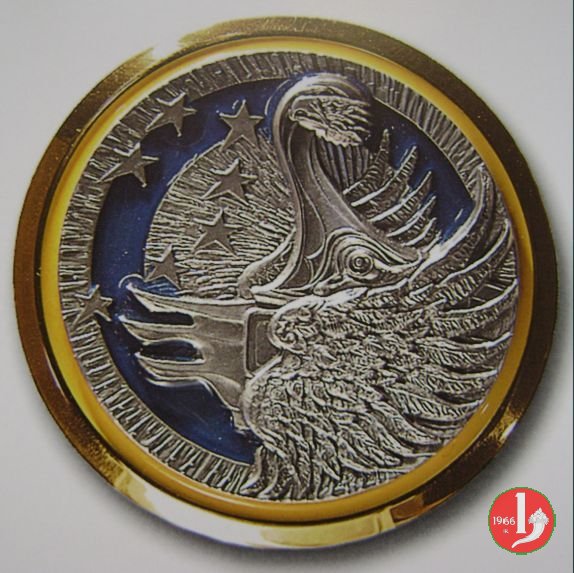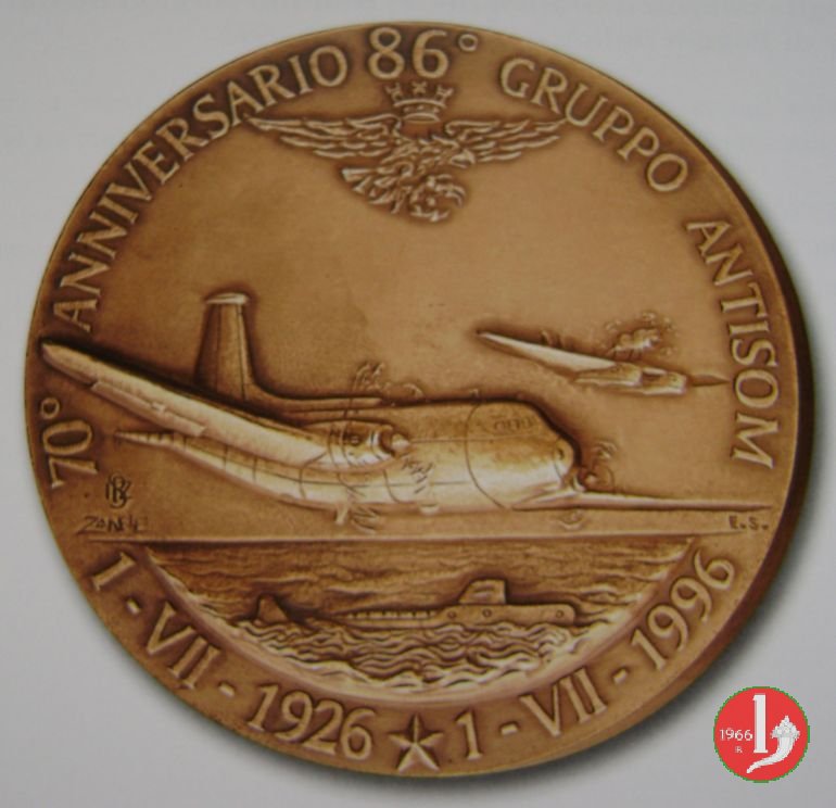 70° Anniversario della fondazione dell'86° Gruppo Antisom Dritto: Raffigurata l'araldica dell'86 Gruppo Antisom; i possenti artigli di un rapace che piomba giú dal cielo stanno per afferrare la pinna di uno squalo che spunta tra le onde; a destra lungo il bordo la firma dell'artista e la data IV 96. Verso: Nel giro la scritta 70° ANNIVERSARIO 86° GRUPPO ANTISOM I - VII -1926 * I - VII - 1996; la scena di un'operazione di caccia ad un mezzo subacqueo, un velivolo Atlantic vola a bassa quota pronto a colpire un sommergibile che emerge sulla superficie del mare; sullo sfondo la rappresentazione di un idrovolante SM 55 è un riferimento al glorioso passato dell'86 Gruppo; in alto un'aquila da pilota militare e a sinistra sopra la line dell'esergo la firma dell'artista. | |
