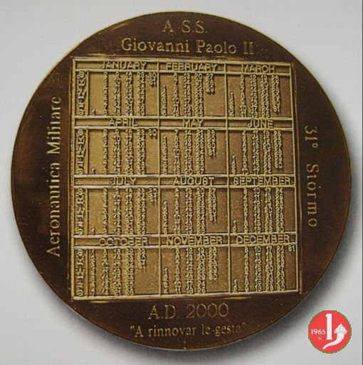 Visita a Castel Gandolfo di Giovanni Paolo II Dritto: Raffigurata l'araldica del 31° Stormo derivata dal distintivo della 1^ Squadriglia Navale Siluranti Aeree, ideato, all'atto della sua costituzione, durante la Prima Guerra Mondiale, dal Comandante Gabriele D'Annunzio; questo distintivo, che si ispira alla simbologia delle antiche monete romane, raffigura una prua di nave, armata di rostro con ali e testa d'aquila, su fondo raggiato e punteggiato di stelle; intorno due fascie circolari di smalti giallo e blu. Verso: Raffigurata la scacchiera con i dodici mesi del calendario; ai lati la scritta AERONAUTICA MILITARE = 31° STORMO; all'esergo, A.D. 2000 = "A RINNOVAR LE GESTA"; in alto la dedica A S.S. = GIOVANNI PAOLO II. | |