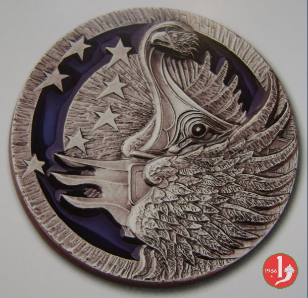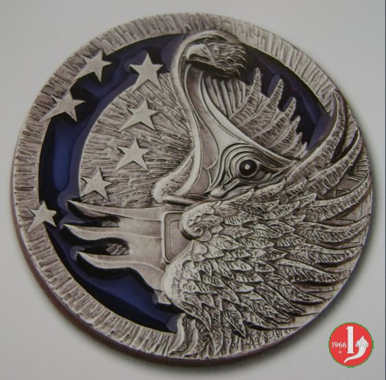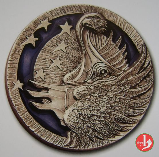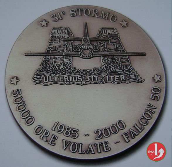 50.000 ore di volo della 93° squadriglia "Falcon 50" Dritto: Raffigurata l'araldica del 31° Stormo derivata dal distintivo della 1^ Squadriglia Navale Siluranti Aeree, ideato, all'atto della sua costituzione, durante la Prima Guerra Mondiale, dal Comandante Gabriele D'Annunzio; questo distintivo, che si ispira alla simbologia delle antiche monete romane, raffigura una prua di nave, armata di rostro con ali e testa d'aquila, su fondo raggiato e punteggiato di stelle; intorno una fascia circolare di smalto blu. Verso: Nel giro la scritta 31° STORMO tra due stellette 50.000 ORE VOLATE - FALCON 50 tra due stellette sopra le date 1985 - 2000; nel campo rappresentazione grafica del Falcon 50, visto di fronte e sovrapposto all'araldica della Squadriglia Bianca di Trasvolatori Atlantici, le colonne di Ercole, che sorgono dall'oceano tempestoso con i motti MUNDI LIMES e ULTERIUS SIT ITER. | |