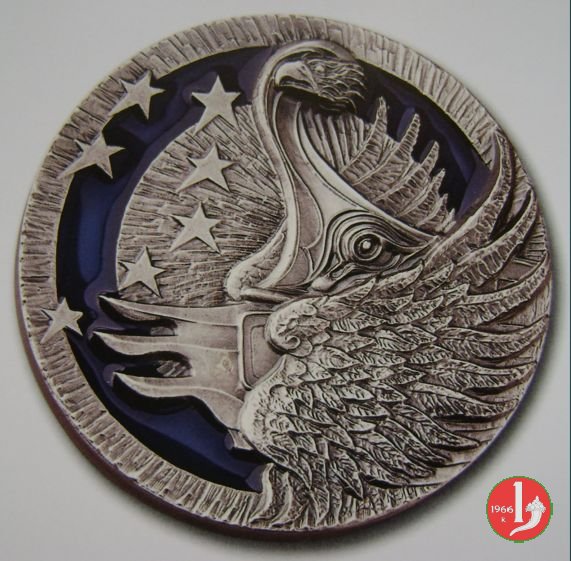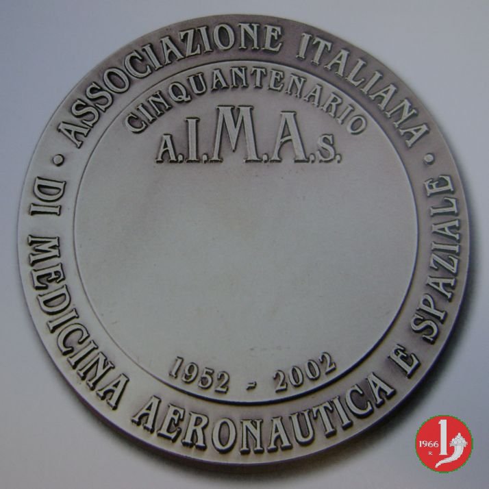 50° Anniversario della costituzione dell'A.I.M.A.S. Dritto: Raffigurato il logo dell'A.I.M.A.S.( Associazione di Medicina Aeronautica e Spaziale), un missile avvolto dalle spire di un serpente alato, mitologica allegoria aeronautica del caduceo di Esculapio, si staglia su un fondo di smalto blu, su cui sono rappresentati la costellazione del carro e altre stelle e pianeti a simboleggiare lo spazio; all'esergo, il globo terrestre; il bordo della medaglia è a fondo raggiato con effetto solare; a destra la firma dell'artista e la data 2002. Verso: Nel giro la scritta ASSOCIAZIONE ITALIANA DI MEDICINA AERONAUTICA E SPAZIALE; su disco centrale rialzato, in alto, su due righe la scritta CINQUANTENARIO = A.I.M.A.S., all'esergo le date 1952 - 2002; il campo è liscio per eventuali iscrizioni e dediche. | |