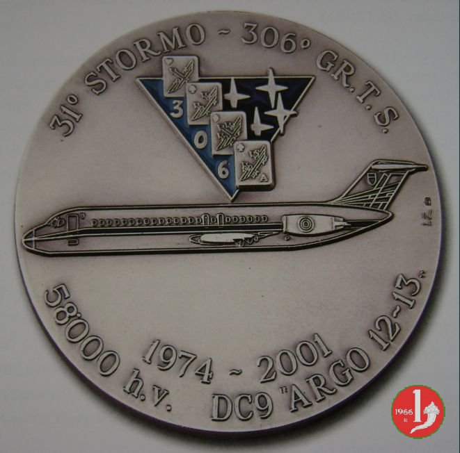 Ultimo volo velivoli DC 9/30, Argo12 e Argo 13 Dritto: Raffigurata l'araldica del 31° Stormo derivata dal distintivo della 1^ Squadriglia Navale Siluranti Aeree, ideato, all'atto della sua costituzione, durante la Prima Guerra Mondiale, dal Comandante Gabriele D'Annunzio; questo distintivo, che si ispira alla simbologia delle antiche monete romane, raffigura una prua di nave, armata di rostro con ali e testa d'aquila, su fondo raggiato e punteggiato di stelle; intorno una fascia circolare di smalto blu. Verso: Nel giro la scriita 31° STORMO - 306° GR.T.S. 58.000 H.V. DC9 "ARGO 12-13" sopra le date 1974 - 2001; al centro della medaglia campeggia la silhouette grafica del DC 9/30 con le insegne del 31° Stormo; in alto il distintivo triangolare del 306° Gruppo, erediatato dal disciolto Reparto Volo Stato Maggiore, con quattro stelle a losanga e quattro carte da gioco con l'asso e la rappresentazione stilizzata di varie tipologie di aerei, già in dotazione al Reparto, su smalti blu e celeste. | |
