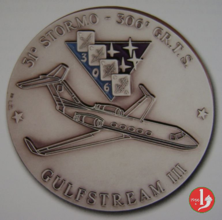 Celebrativa dei velivoli Gulfstream III Dritto: Raffigurata l'araldica del 31° Stormo derivata dal distintivo della 1^ Squadriglia Navale Siluranti Aeree, ideato, all'atto della sua costituzione, durante la Prima Guerra Mondiale, dal Comandante Gabriele D'Annunzio; questo distintivo, che si ispira alla simbologia delle antiche monete romane, raffigura una prua di nave, armata di rostro con ali e testa d'aquila, su fondo raggiato e punteggiato di stelle; intorno una fascia circolare di smalto blu. Verso: Nel giro la scritta 31° STORMO - 306 GR. T.S. stella GULFSTREAM III stella; al centro della medaglia campeggia la rappresentazione grafica del velivolo Gulfstream III, visto di tre quarti rivolto verso destra, in alto il distintivo triangolare del 306° Gruppo, già appartenuto al disciolto reparto Volo Stato Maggiore; il distintivo è costituito da quattro assi, su cui compaiono, stilizzati, i velivoli in dotazione al Reparto Volo Stato Maggiore e da quattro stelle a losanga; su smalti blu e celeste, a sinistra le iniziali dell'artista. | |