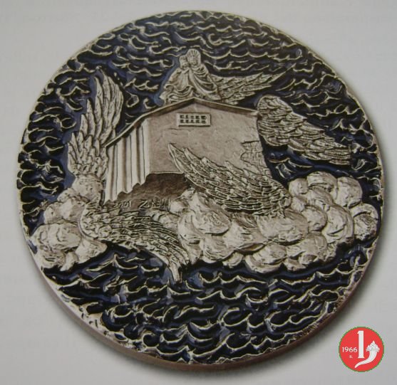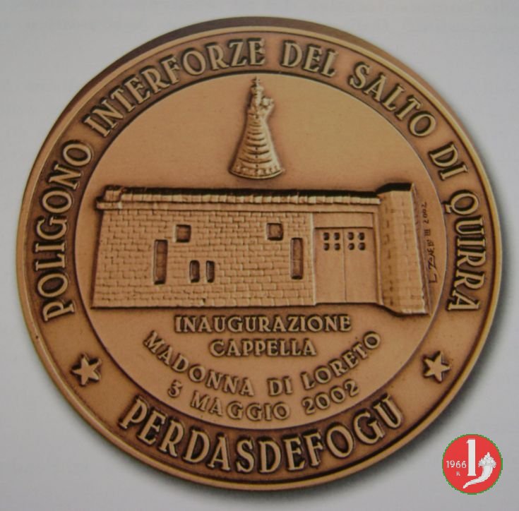 Inaugurazione della Cappella dedicata alla Madonna di Loreto Dritto: In esergo su cartiglio la scritta POLIGONO INTERFORCE DEL SALTO DI QUIRRA; raffigurata la Sardegna orograficamente modellata su cui capeggia lo Stemma araldico del Poligono interforce Salto di Quirra, nel punto esatto della sua localizzazione, a sud - est dell'isola; dallo Stemma un missile ritto su uno scudo, partito in tre bande, con i colori delle tre Forze Armate, si irradiano dei settori circolari e radiali rappresentanti le onde del radar, incisi sul fondo della medaglia; a destra lungo il bordo la firma dell'artista e la data 92. Verso: Nel giro la scritta POLIGONO INTERFORCE DEL SALTO DI QUIRRA PERDASDEFOGU tra due stellette; in esergo la scritta su quattro righe INAUGURAZIONE = CAPPELLA = MADONNA DI LORETO = 3 MAGGIO 2002; il frontone della piccola Cappella dedicata alla Madonna di Loreto, patrona dell'A.M. e sovrastante l'edificio, l'immagine di culto; a destra la firma dell'artista e la data III 2002. | |