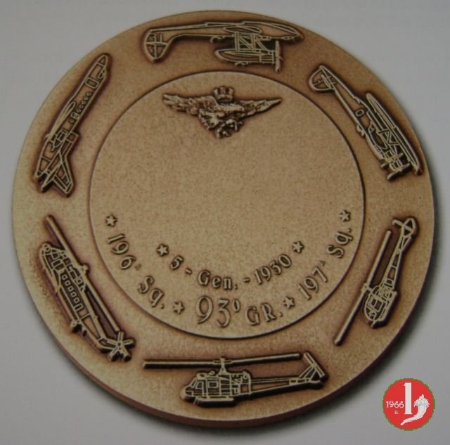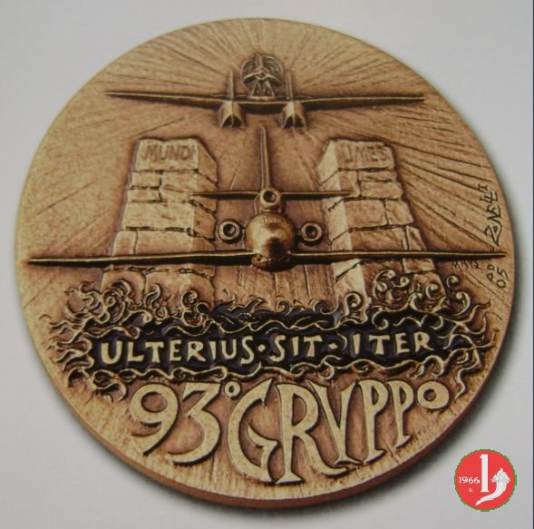 75° Anniversario costituzione 93° Gruppo Volo Dritto: Raffigurazione dello stemma araldico del 93° Gruppo: le colonne di Ercole, sulle quali è incisa la scritta MUNDI LIMES, che si ergono sull'Oceano tempestoso; le due colonne sono sorvolate dallo storico velivolo S.55 mentre in primo piano si staglia un falcon 50, fra le onde del mare, intarsiate da smalti blu e azzurro, il motto ULTERIUS SIT ITER, sotto la scritta 93° GRUPPO; fondo raggiato, nel campo a destra sotto un'ala del falcon 50, le iniziali del nome della pittrice Mimí Buzzacchi Quilici autrice della storia araldica della Squadriglia Bianca dei Trasvolatori Atlantici a cui si è ispirato l'artista; lungo il bordo a destra la data A.D. 05 e la firma dell'artista. Verso: Nel giro su piano inclinato le silhouette grafiche di tre aeromobili storici e tre attualmente in forza al Gruppo sfilano in un carosello temporale; su tondo centrale rialzato, in alto, un'aquila da pilota militare ed all'esergo, tra due stellette militari, la data di costituzione del Gruppo 5-GEN.-1930 e sotto, intervallati da stellette, il nome del Gruppo 93° GR. tra quello delle squadriglie che lo compongono 196^ Sq. - 197^ Sd.; il campo della medaglia è lasciato libero per l'incisione di eventuali dediche. | |