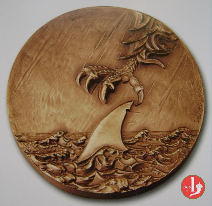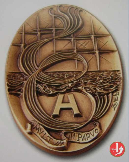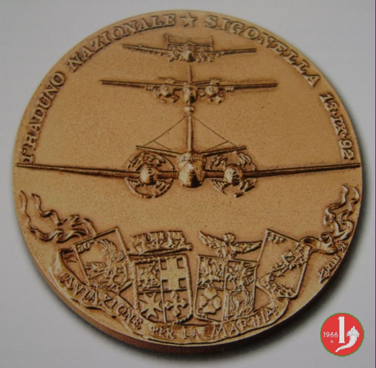 1° Raduno Nazionale dell'Aviazione per la Marina Dritto: Raffigurato il distintivo di specialità del personale operativo dei reparti antisommergibile; un guanto ferrato piomba dal cielo pre trafiggere con un tridente uno squalo la cui pinna spunta tra le onde del mare; un'aquila da pilota militare, in alto, ed un'ancora, in basso, simboleggianti l'A.M. e la Marina Militare, sono unite da una corona d'alloro; intorno, una fascia di smalto blu, delimitata dalla cornice della medaglia a forma di gomena marinara; a destra, su una foglia, la firma dell'artista. Verso: Nel giro la scritta 1° RADUNO NAZIONALE SIGONELLA 13 IX 92 intercalata da una stelletta militare; al centro della medaglia campeggia il velivolo Breguet 1150, attualmente in dotazione ai reparti antisommergibile ed in alto, in secondo piano, i due velivoli storici Lockeed PV2 e Grumman S-2A impiegati nel dopoguerra; in basso, le araldiche dell'A.M. e della M.M. affiancate da quelle del 30° e 41° Stormo e , sotto, un cartiglio con la scritta AVIAZIONE PER LA MARINA; a destra lungo il bordo la firma dell'artista e la data 92. | |