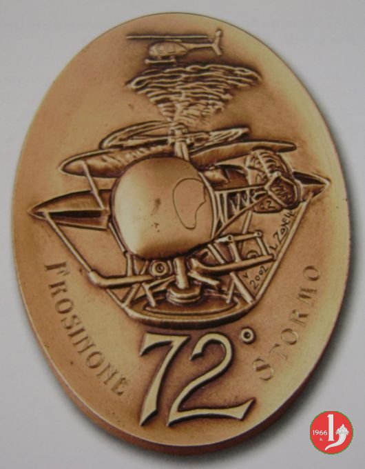 Medaglia del 72° Stormo di Frosinone Dritto: Raffigurazione dell'araldica del 72° Stormo; al centro della medaglia ovale, una fascia orizzontale con il mare, sovrastato dalle stelle della costellazione dell'Orsa Maggiore, simbolo di navigazione, sul piano dell'esergo della medaglia una grande lettera H in rilievo, segno convenzionale identificativo degli elicotteri, sotto cui è un cartiglio con il motto MVLTVM IN PARVO; sovrapposta alla rappresentazione è una spirale a forma di letterea E; lungo il bordo a destra le firma dell'artista. Verso: All'esergo la scritta FROSINONE 72° STORMO; raffigurata una allegoria della storia del volo verticale: l'istrumento a vite inventato da leonardo da Vinci, rappresentatoin incusso e sovrastato dallo storico A.B. 47/G primo elicottero in dotazione alla vecchia S.V.E.; nella parte alta della medaglia, in dimensioni piú piccole è rappresentato l'elicottero N.H. 500/E attualmente in dotazione allo Stormo, nel campo a destra la data 2002 e la firma dell'artista. | |