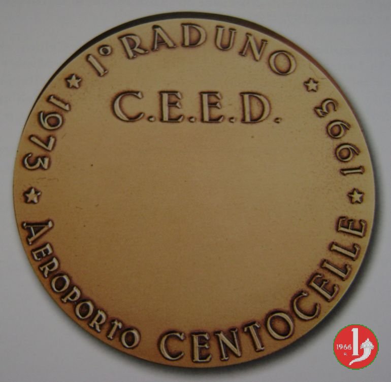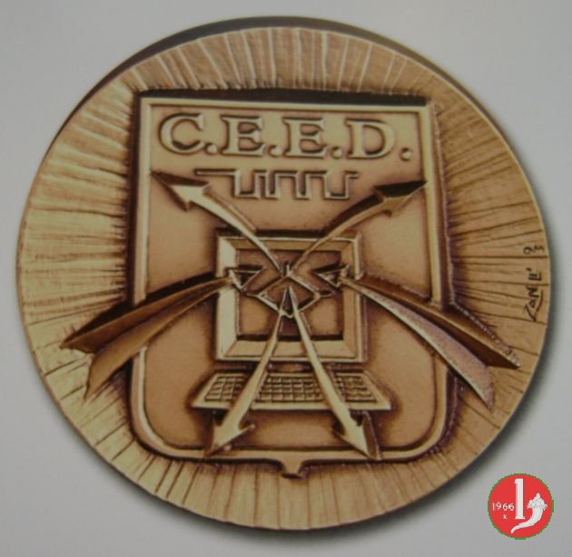 20° Anniversario del C.E.E.D. Dritto: Raffigurata l'araldica del Centro Elettronico Elaborazione Dati; su uno scudo sannita è raffiguarato un monitor con tastiera, elemento base per una rete di trasmissione dati, allegoricamente simboleggiata dalle frecce in entrata ed in uscita dallo schermo, su cui compare uno dei simboli piú significatifi della programmazione, la F; sopra il monitor, un segnale ad onda quadra, che rappresenta in forma grafica, un dato binario codificato, in alto C.E.E.D.; lo scudo è posto su fondo raggiato; a destra la firma dell'artista e la data 93. Verso: Nel grio la scritta I° RADUNO tra due stellette intorno ed in alto; le date 1973 - 1993 e la legenda AEROPORTO CENTOCELLE tra due stellette nel giro; la scritta C.E.E.D. nel campo in alto; al centro uno spazio vuoto per l'iscrizione di eventuali dediche. | |